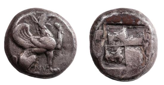 Ionia. Teos. Stater c. 500-450 BC. 19 mm. 11.7 gm. Obv: Griffin seated right, raising forepaw; NV below. Rev: Quadripartite incuse square. Balcer group II, 8. VIDEO