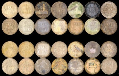 1976 Austria - Innsbruck Olympic Games 14 Coin Set (KM-2926-2929) the set includes both the UNC (7) & Proof (7) coins.  Struck for the Innsbruck 1976 Olympic Games.The Hall Mint, one of the oldest mints in Europe was reopened to strike some of the coins. The set contains almost 7 ounces of silver.  All coins have wild multicolored toning from the original mint packaging. As struck.  Getting very scarce to find.