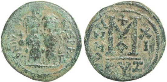 Byzantine Empire - Justin II & Sophia AE follis - Cyzicus- Year XI
