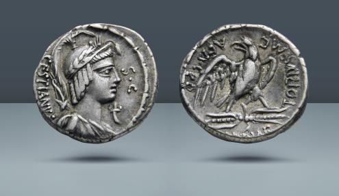 The obverse of this coin shows a winged bust of a deity. The image has often been attributed to the Sabine goddess Vacuna, the goddess that people turned to for missing or absent family and friends. Michael Crawford postulates that the bust on the obverse of this coin could actually be Isis and the reverse a Ptolemaic eagle. While the connection between Egypt and this moneyer is uncertain, Rome was omnipresent in the land of the Egyptians. At the time this coin was struck in 67 BC, Egypt had become really just a Roman protectorate since it was terribly weakened by constant infighting. The reverse does indeed resemble the Ptolemaic eagle and even shows the eagle standing on a thunderbolt. It therefore would not be surprising that the Egyptian influence should effect the Republican coinage.