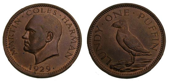 Lundy Island 1929 One Puffin Token Martin Coles Harman KM# TN2 Choice BU Rare This Nice.