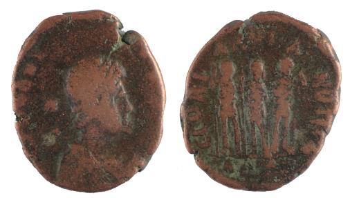 Honorius AD 393-423. Ӕ 14 mm. 1.7 gm. Obv: D N HONORIVS P F AVG, pearl-diademed, draped and cuirassed bust right Rev: GLORIA ROMANORVM, three emperors (Arcadius, Honorius & Theodosius II) standing, holding spears;; RIC 149.