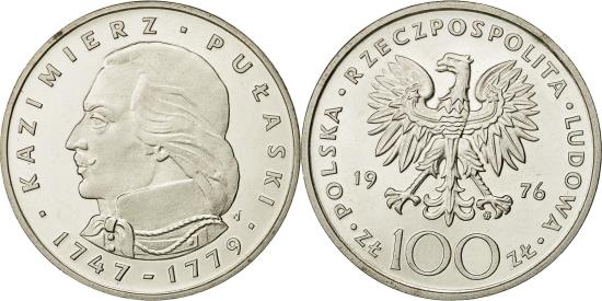 | | Coin, Poland, 100 Zlotych, 1976, Warsaw, , Silver, KM:84 | | | Imperial eagle above value, Head of Kazimierz Pulaski left | | FEATURES |