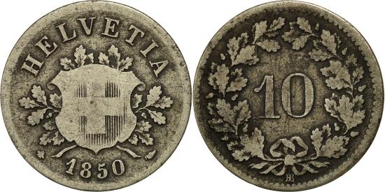 | | Coin, Switzerland, 10 Rappen, 1850, Strasbourg, , Billon, KM:6 | | | Shield within sprigs, date below, Value within wreath, HELVETIA | | FEATURES |