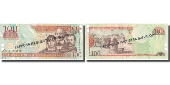 | | Banknote, Dominican Republic, 100 Pesos Oro, 2003, 2003, Specimen, KM:171s3 | | | 2003. Specimen. Overprint: ESPECIMEN / MUESTRA SIN VALOR in black on both sides. Punch hole cancelled., F. R. Sanches, J. P. Duarte and M. R. Mella at right. Wide border printing at upper center right., Puerta del Conde at left., Dark brown and orange on multicolor underprint. | | FEATURES |