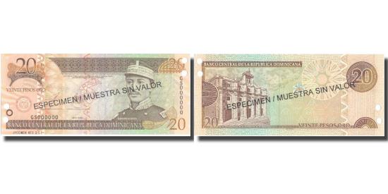 | | Banknote, Dominican Republic, 20 Pesos Oro, 2003, 2003, Specimen, KM:169s3 | | | Specimen. 2003. Overprint: ESPECIMEN / MUESTRA SIN VALOR in black on both sides. Punch hole cancelled., Gregorio Luperon at right. Wide border printing at upper center right., Panteón Nacional at left., #170-174 wmk: Duarte., Brown on peach, green and multicolor underprint. | | FEATURES |