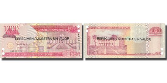 | | Banknote, Dominican Republic, 1000 Pesos Oro, 2006, 2006, Specimen, KM:180s1 | | | 2006. Specimen. Overprint in black: ESPECIMEN / MUESTRA SIN VALOR once on each side. Punch hole cancelled., Palacio Nacional at right., Alcazae de Don Diego Colon at left., Red and deep lilac on multicolor underprint. | | FEATURES |