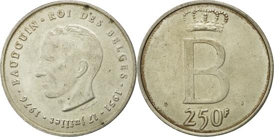 | | Coin, Belgium, 250 Francs, 250 Frank, 1976, Brussels, , Silver | | | Head of Baudouin, left, legend in French, Crowned large B, denomination below, Mint mark - Angel head. Mintmaster Vogeleer's privy mark - Bird., ROI DES BELGES | | FEATURES |
