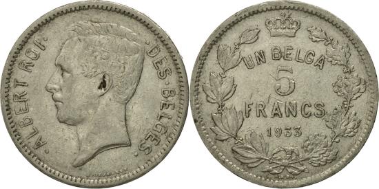 | | Coin, Belgium, 5 Francs, 5 Frank, 1933, , Nickel, KM:97.1 | | | Head of Albert, left, Wreath surrounds denomination and date, crown at top, value: UN BELGA, All dates exist in position A and B, values are the same., DES BELGES | | FEATURES |