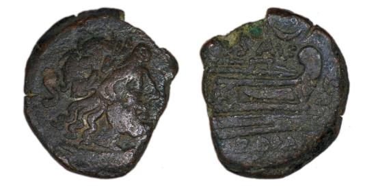 Æ Semis, approx. 25 mm, 11.13 g, 11 h Rome mint, (152 B.C.), L. Saufeius Obv: helmeted head of Saturn right, “S” (mark of value) behind Rev: prow of galley facing right; L • SAVF (“VF” ligate) & crescent above, “S” (mark of value) to right, ROMA below cf. Crawford 204/3; Sydenham 385a F-VF, some roughness & scattered light scratches, irregular flan. Rare. |