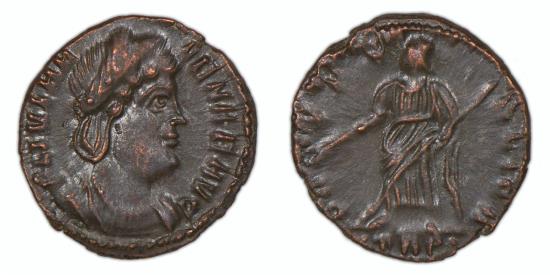 Helena, Augusta (324 – 328/30 A.D.) mother of Constantine The Great Æ Follis, approx. 16 mm, 2.05 g, 11 h Augusta Treverorum (Trier) mint, 1st officina, posthumous issue struck 337 – 341 A.D. Obv: FL IVL HELENAE AVG, diademed & draped bust of Helena right Rev: PAX PV [-] BLICA, Pax standing left, holding branch and scepter; • TRP • in exergue cf. RIC VIII 63; LRBC 112 EF |