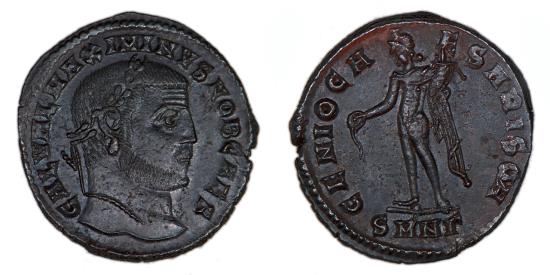 Maximinus II Daia (310 – 313 A.D.) Caesar (305 – 308 A.D.) Æ Follis, approx. 25 mm, 6.33 g, 12 h Nicomedia mint, (305 – 307 A.D.), 3rd officina Obv: GAL VAL MAXIMINVS NOB C, laureate bust of Maximinus II right Rev: GENIO CA [-] ESARIS CMH, Genius standing left, modius upon his head, holding a patera from which liquor flows, a cornucopia in his left hand, SMNΓ in exergue EF, attractive and with a bold portrait cf. RIC 55 |