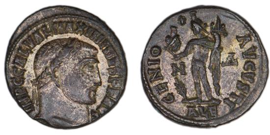 Maximinus II Daia (310 – 313 A.D.) Æ Follis, approx. 21 mm, 4.54 g, 5 h Alexandria mint, (312 – 313 A.D.), 4th officina Obv: IMP C GAL VAL MAXIMINVS P F AVG, laureate bust of Maximinus II right Rev: GENIO AVGVSTI, Genius standing left, holding a small bust of Serapis, a cornucopia in his left hand. * / N / [palm branch] to left, Δ (officina mark) to right, ALE in exergue Near EF, much silvering remaining cf. RIC 160b |