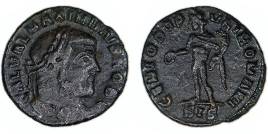 Maximinus II Daia (310 – 313 A.D.) Caesar (305 – 308 A.D.) Æ Quarter Follis, 19 mm, 1.92 g, 6 h Siscia mint, (305 – 306 A.D.) Obv: GAL VAL MAXIMINVS NOB C, laureate bust of Maximinus II right Rev: GENIO POP [-] VLI ROMANI, Genius standing left, modius upon his head, holding a patera from which liquor flows, a cornucopia in his left hand, SIS in exergue F-VF, some roughness cf. RIC 170b. Rare. |