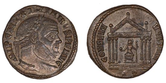 Maximianus (second reign, 307 – 308 A.D.) Æ Follis, approx. 26 mm, 6.57 g, 6 h Ticinum mint, (307 – 308 A.D.), 1st officina, 3rd emission, 1st phase Obv: IMP C MAXIMIANVS P F AVG, laureate bust of Maximianus right Rev: CONSERV [-] VRB SVAE, Roma seated left, holding a long scepter and a globe, all within a hexastyle temple. Knobs as acroteria, temple’s pediment empty. P T in exergue Near EF, some traces of silvering cf. RIC 92, Drost 16 |