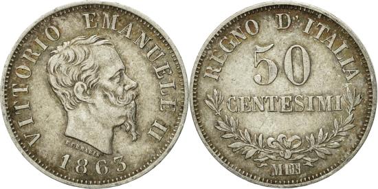 | | Coin, Italy, Vittorio Emanuele II, 50 Centesimi, 1863, Milan, , Silver | | | Head right, Value above sprays, VITTORIO EMANUELE II | | FEATURES |
