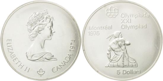 | | Coin, Canada, Elizabeth II, 5 Dollars, 1974, Royal Canadian Mint, Ottawa | | | Young bust right, small maple leaf below, date at right, Canoeing, denomination below, Series III. | | FEATURES |
