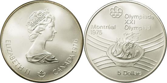 | | Coin, Canada, Elizabeth II, 5 Dollars, 1976, Royal Canadian Mint, Ottawa | | | Young bust right, maple leaf below, date at right, Olympic flame, denomination below, Series VII. | | FEATURES |