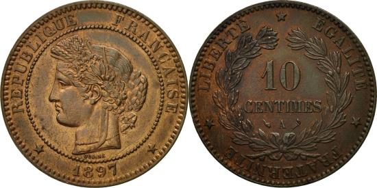 | | Coin, France, Cérès, 10 Centimes, 1897, Paris, , Bronze, KM:815.1 | | | Cérès, Laureate head left, Denomination within wreath | | FEATURES |