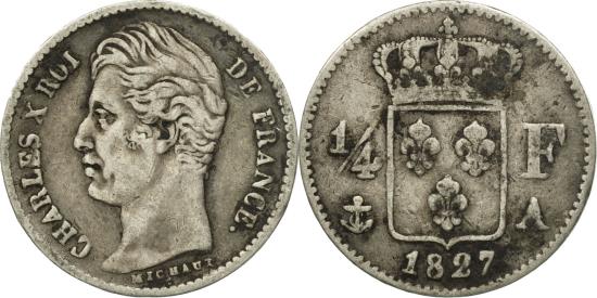 | | Coin, France, Charles X, 1/4 Franc, 1827, Paris, , Silver, KM:722.1, Le | | | Charles X, Head left, Crowned arms divide denomination, CHARLES X ROI DE FRANCE | | FEATURES |