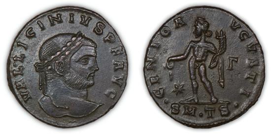Licinius I (308 – 324 A.D.) Æ Follis, approx. 25 mm, 6.47 g, 12 h Thessalonica mint, (late 308 – 310 A.D.) 3rd officina Obv: VAL LICINIVS P F AVG, laureate bust of Licinius right Rev: GENIO A [-] VGVSTI, Genius standing left, modius upon his head, holding a patera from which liquor flows, a cornucopia in his left hand, * in field to left, Γ in field to right, • SM • TS • in exergue Near EF cf. RIC 30b |