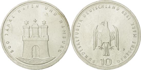 | | Coin, GERMANY - FEDERAL REPUBLIC, 10 Mark, 1989, Hamburg, Germany, | | | Small eagle above denomination, Three towered city gate, waves below | | FEATURES |