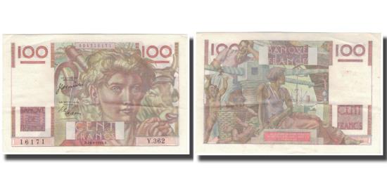| | France, 100 Francs, 100 F 1945-1954 ''Jeune Paysan'', 1950-08-24, UNC(63) | | | Signature P. Rousseau and R. Favre-Gilly. 7.11.1945-9.1.1947., Farmer with two oxen., Man, woman and children at dockside., Brown, red and multicolor. | | FEATURES |