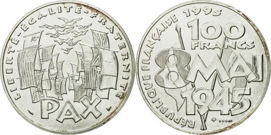 | | Coin, France, 8 mai 1945, 100 Francs, 1995, Pessac, ESSAI, , Silver | | | 8 mai 1945, Victory in Europe date, May 8,1945, Birds in flight above banners, PAX below | | FEATURES |
