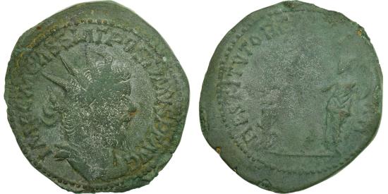 | | Coin, Postumus, Double Sestertius, AD 261, Trier or Cologne, , Bronze | | | Very nice green olive patina, Radiate head right, Postumus in military dress standing left, holding sceptre in left hand, right foot on captive, raising kneeling female figure wearing mural crown, IMP C M CASS LAT POSTVMVS PF AVG, RESTITVTOR GALLIAR | | FEATURES |