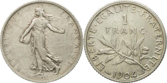 | | Coin, France, Semeuse, Franc, 1904, Paris, , Silver, KM:844.1 | | | Semeuse, Figure sowing seed, Leafy branch divides date and denomination, Without mint mark. | | FEATURES |