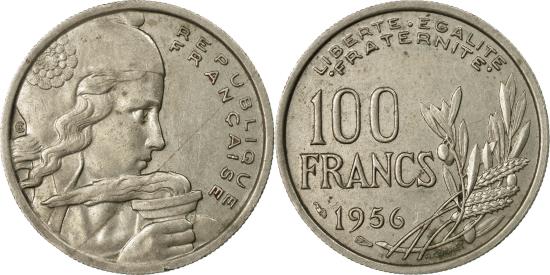 | | Coin, France, Cochet, 100 Francs, 1956, , Copper-nickel, KM:919.1, Le | | | Cochet, Liberty bust with torch right, Denomination above date at left, grain sprigs at right | | FEATURES |