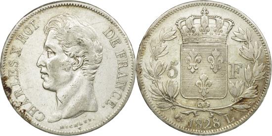 | | Coin, France, Charles X, 5 Francs, 1828, Bayonne, , Silver, KM:728.8 | | | Charles X, Type II, Crowned arms divide denomination within wreath | | FEATURES |