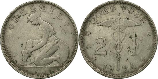 | | Coin, Belgium, 2 Francs, 2 Frank, 1924, , Nickel, KM:92 | | | Kneeling figure, legend in Dutch, Caduceus divides denomination and date, BELGIE | | FEATURES |