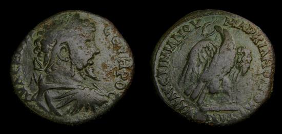 Obv: Laureate, draped, and cuirassed bust right, seen from behind Rev: Eagle standing right on thunderbolt, head turned left, holding wreath in beak.