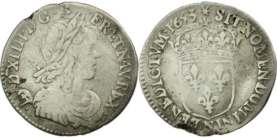 | Coin, France, Louis XIV, 1/12 Ecu à la mèche longue, 1653, Montpellier |