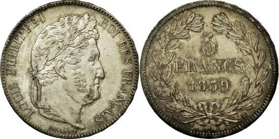 | | Coin, France, Louis-Philippe, 5 Francs, 1839, Rouen, , Silver | | | Louis-Philippe, Laureate head right, Mint marks at edge outside wreath | | FEATURES |