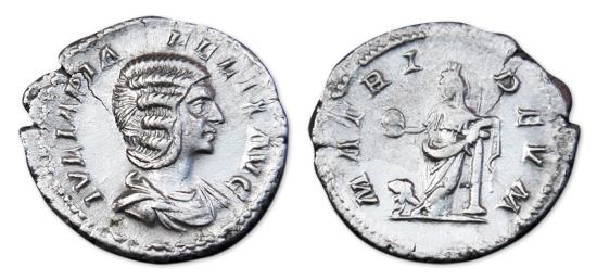 Julia Domna AR Denarius. 212 AD. (20 mm, 2.4 g) IVLIA PIA FELIX AVG, draped bust right. MATRI DEVM, Cybele standing left, leaning on column, holding drum & scepter, lion at foot. RIC 382, RSC 137.gVF |