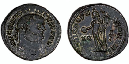 Maximianus (286 – 305 A.D.) Æ Follis, approx. 27 mm, 10.31 g, 11 h Alexandria mint, (ca. 301 A.D.), 4th officina Obv: IMP C M A MAXIMIANVS P F AVG, laureate bust of Maximianus right Rev: GENIO POPV [-] LI ROMANI, Genius standing left, modius on his head, holding patera in his right hand, a cornucopia in his left hand, XX to left, ∆ (officina mark) / I to right, ALE in exergue VF-EF, traces of original silvering remaining cf. RIC 32b |
