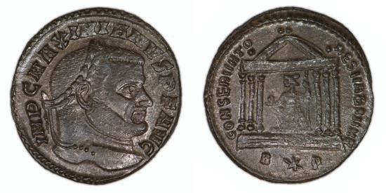 Maximianus (second reign, 307 – 308 A.D.) Æ Follis, approx. 25 mm, 6.59 g, 5 h Rome mint, (307 – 308 A.D.), 1st officina, 3rd emission, 1st phase Obv: IMP C MAXIMIANVS P F AVG, laureate bust of Maximianus right Rev: CONSERVATO [-] RES VRB SVAE, Roma seated left, holding a long scepter and a globe, all within a hexastyle temple. Knobs as acroteria, temple’s pediment empty. R * P in exergue Near EF, some traces of silvering cf. RIC 194b, Drost 76 |
