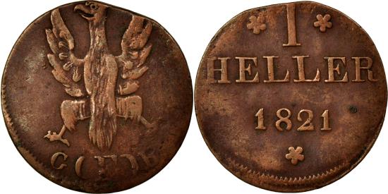 | | Coin, German States, FRANKFURT AM MAIN, Heller, 1821, , Copper, KM:301 | | | Crowned eagle with wings raised, Denomination, date, Varieties exist. | | FEATURES |