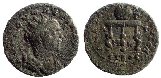Cilicia, Anazarbus. Valerian I. AD 253-260. Æ 26 mm. 14.0 gm. Dated CY 272 (AD 253/4). Obv: Radiate, draped, and cuirassed bust right Rev: Prize urn, containing palm frond, set upon agonistic table with three decorated legs; ЄT BOC (date) in exergue. Ziegler 808; SNG von Aulock 5512; SNG Copenhagen 58; SNG Levante 1524.