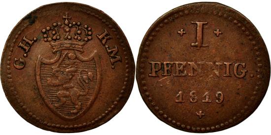 | | Coin, German States, HESSE-DARMSTADT, Ludwig X, Pfennig, 1819, | | | GH-KM flank crown above arms on pointed shield, Denomination, date | | FEATURES |