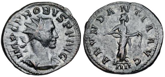 Probus A.D. 276- 277 Ӕ Antoninianus 22x23mm 4.2gm IMP C PROBVS P F AVG; Radiate, cuirassed bust right. ABVNDANTIA AVG; Abundantia stg. r., emptying cornucopiae. In ex. IIII RIC V Lugdunum 17