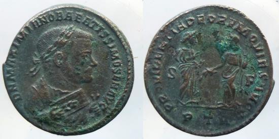 Maximianus Herculis As Senior Augustus, 305-310 AE Follis, Trier, 305-306 25 mm / 8.62 g D N MAXIMIANO BAEATISSIMO SEN AVG Laureate bust right, wearing imperial mantle, holding olive branch and mappa R/ PROVIDENTIA DEORVM QVIES AVGG Providentia standing right, receiving olive branch from Quies standing left, holding sceptre S|F//PTR RIC.673 nice coin |