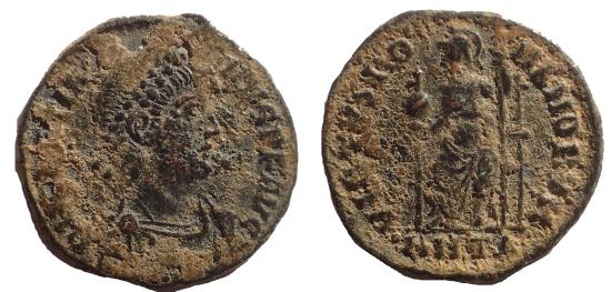Valentinian II, AD 375-392, Ae 18 mm. 3.0 gm. Antioch mint. Obv: Diademed bust right. Rev: VIRTVS ROMANORVM, Roma seated, holding globe. ANT A in exergue.
