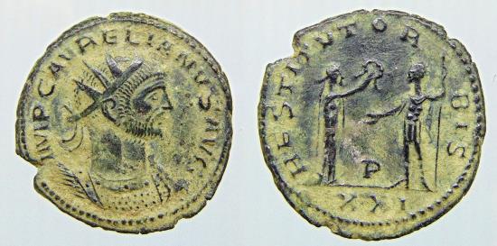 Radiate and cuirassed bust right. IMP C AVRELIANVS AVG