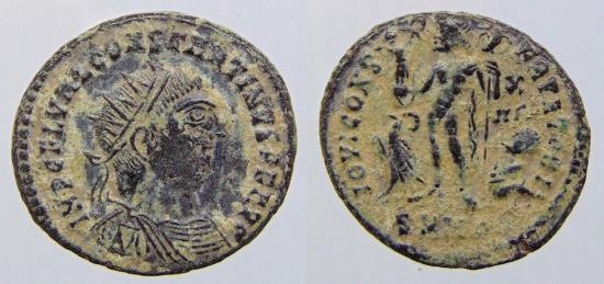 Constantine AE follis 321-324 AD. IMP C FL VAL CONSTANTINVS PF AVG, radiate, draped and cuirassed bust right / IOVI CONSERVATORI, Jupiter standing left, holding Victory on a globe and sceptre, eagle at foot left with wreath in its beak, captive at foot right, denomination X over IIΓ in right field. 3,34gr; 18mm. Mintmark SMHB(or B). Similar to CNG eAuction. Auction 405. Lot 452 sold for $ 120. |