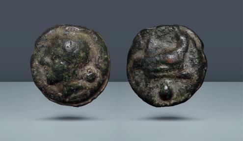 Roman Republic AE Uncia. Anonymous. Rome, c. 225/217 BC. AE Uncia, 19.61g (22mm, 12h). Head of Roma l. wearing Attic helmet; behind, pellet of value / Prow of ship right; under pellet of value.