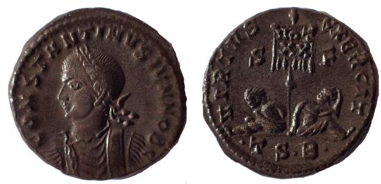 Constantine II (Caesar, 316-337). Ae Follis. 19 mm. 3. 1 gm. Thessalonica. Obv: CONSTANTINVS IVN NOB C. Laureate, draped and cuirassed bust left. Rev: VIRTVS EXERCIT. Vexillum inscribed VOT / XX in two lines; bound captive to left and right; S - F // •TS•B•. RIC 80.