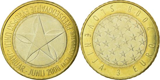 | | Slovenia, 3 Euro, 2008, , Bi-Metallic, KM:81 | | | Field of stars representing EU membership, Pinwheel | | FEATURES |